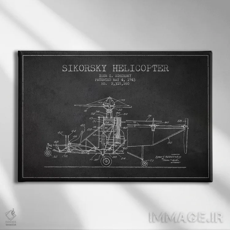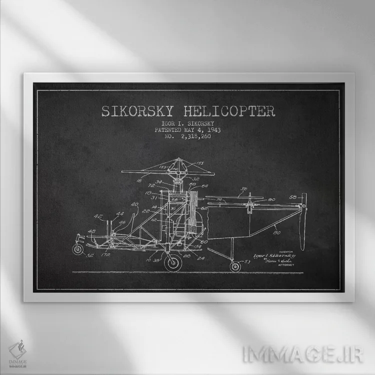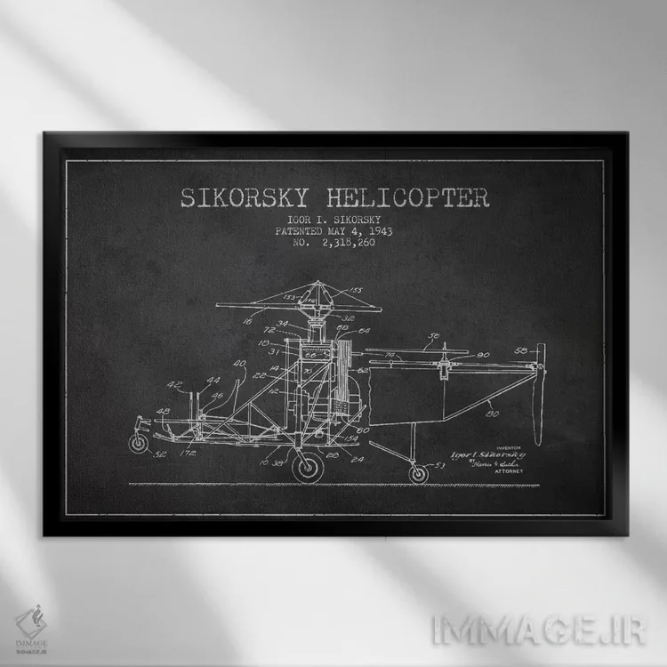 اگر دکور شما کلاسیک/رترو است، «نقشهٔ ثبت اختراع هلیکوپتر (زغالی)» اثرِ «پیکسل کهنه (استودیو/نام هنری)» با سبک هنری کاملاًً مینشیند.