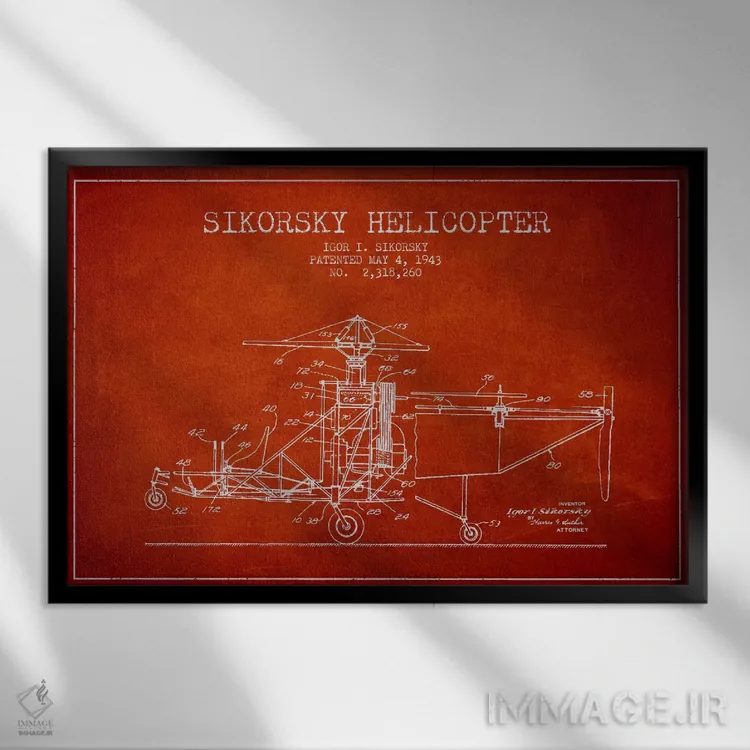 تابلو دکوراتیوِ «نقشهٔ ثبت اختراع هلیکوپتر (قرمز)»؛ مناسب برای فضاهایی با چوب تیره، چراغهای گرم و اکسسوریهای کلاسیک اثرِ «پیکسل کهنه (استودیو/نام هنری)».