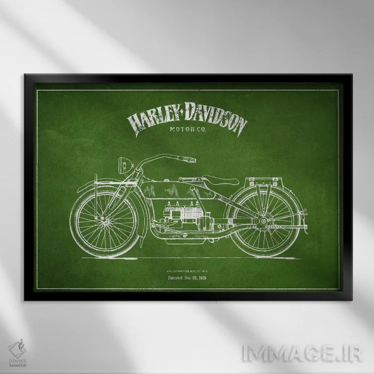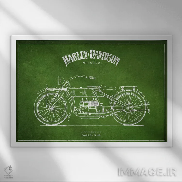 تابلو دکوراتیوِ «نقشه ثبت اختراع هارلی—دیویدسون (سبز)»؛ مناسب برای فضاهایی با چوب تیره، چراغهای گرم و اکسسوریهای کلاسیک اثرِ «پیکسل کهنه (استودیو/نام هنری)».