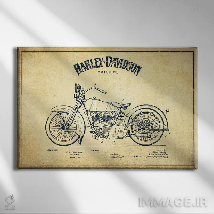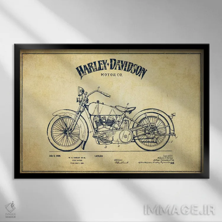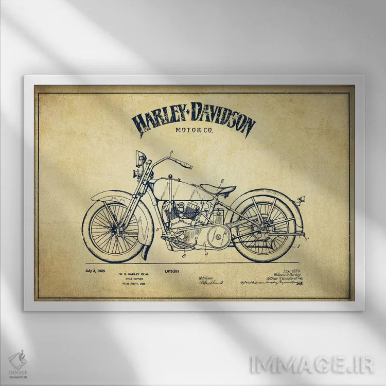 تابلو دکوراتیوِ «نقشه ثبت اختراع هارلی—دیویدسون (کلاسیک)»؛ مناسب برای فضاهایی با چوب تیره، چراغهای گرم و اکسسوریهای کلاسیک اثرِ «پیکسل کهنه (استودیو/نام هنری)».