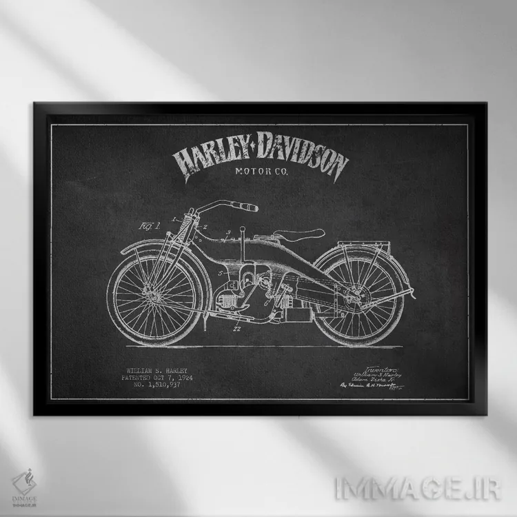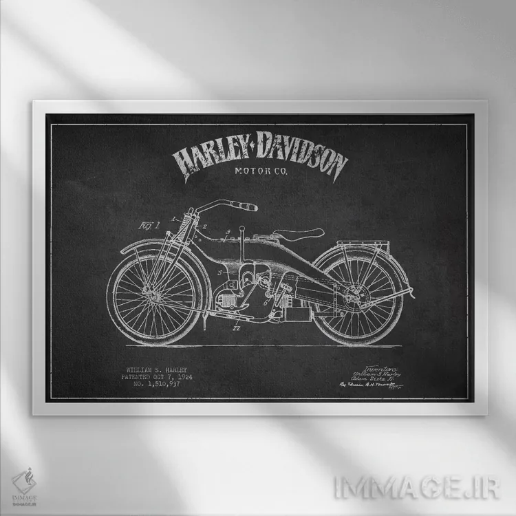 تابلو دکوراتیوِ «نقشه ثبت اختراع هارلی—دیویدسون (ذغالی)»؛ مناسب برای فضاهایی با چوب تیره، چراغهای گرم و اکسسوریهای کلاسیک اثرِ «پیکسل کهنه (استودیو/نام هنری)».