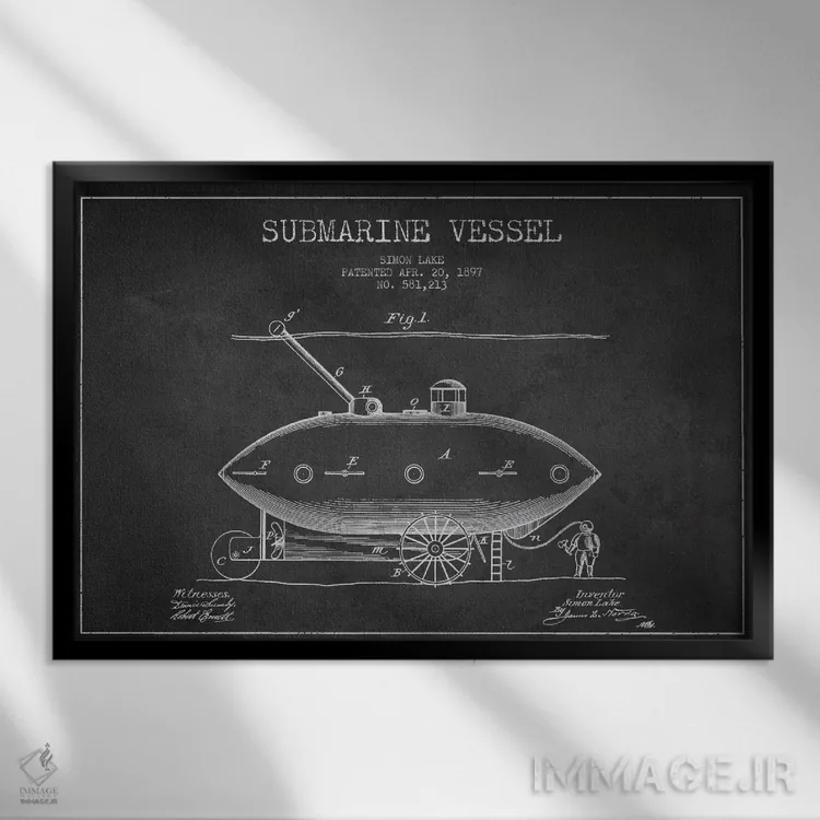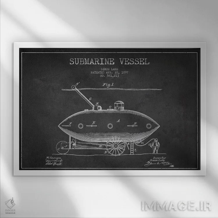 «نقشهٔ ثبت اختراع زیردریایی (زغالی)» اثرِ «پیکسل کهنه (استودیو/نام هنری)» با حالوهوای هنری، حس نوستالژیِ کنترلشدهای به فضا میدهد؛ مناسب برای چیدمانهای رترو و کلاسیک.