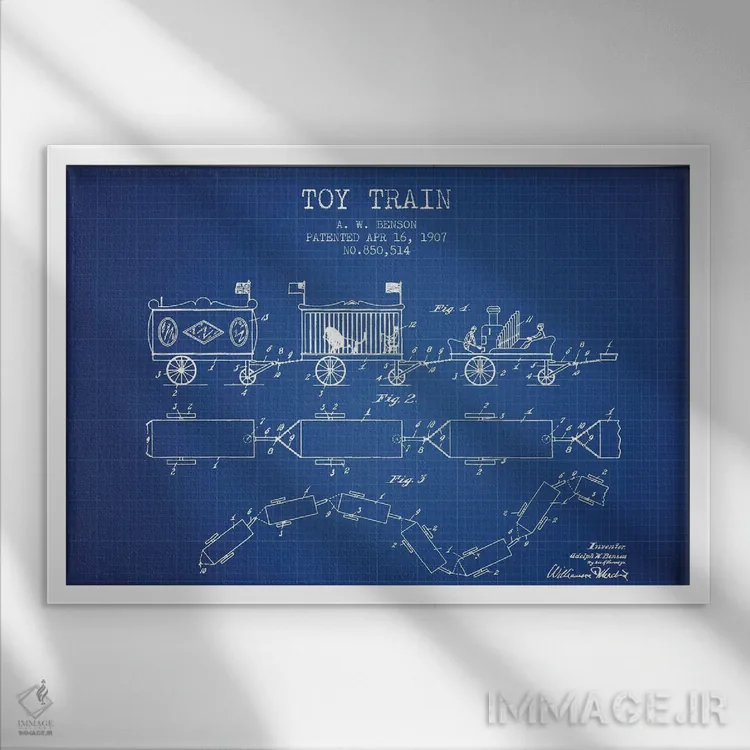 «طرح ثبت اختراع قطار اسباب بازی آ. دبلیو. بنسون (بلوبرینت/آبی فنی)» اثرِ «پیکسل کهنه (استودیو/نام هنری)» برای فضاهای گرم و صمیمی مناسب است؛ بهخصوص کنار چوب تیره و نور زرد.