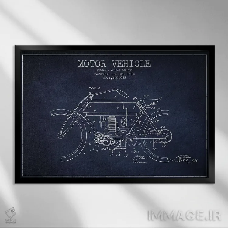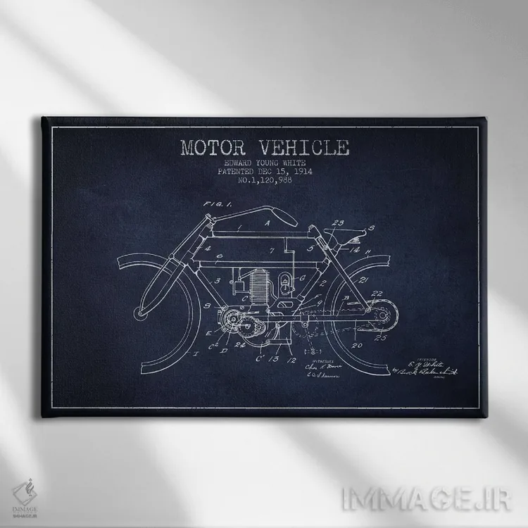 «طرح پتنت وسیله نقلیه موتوردار ادوارد وای. وایت (آبی نفتی)» اثرِ «پیکسل کهنه (استودیو/نام هنری)» برای راهرو، ورودی یا دیوارهای کوچک هم گزینهی خوبیست؛ چون حسش فوری منتقل میشود.