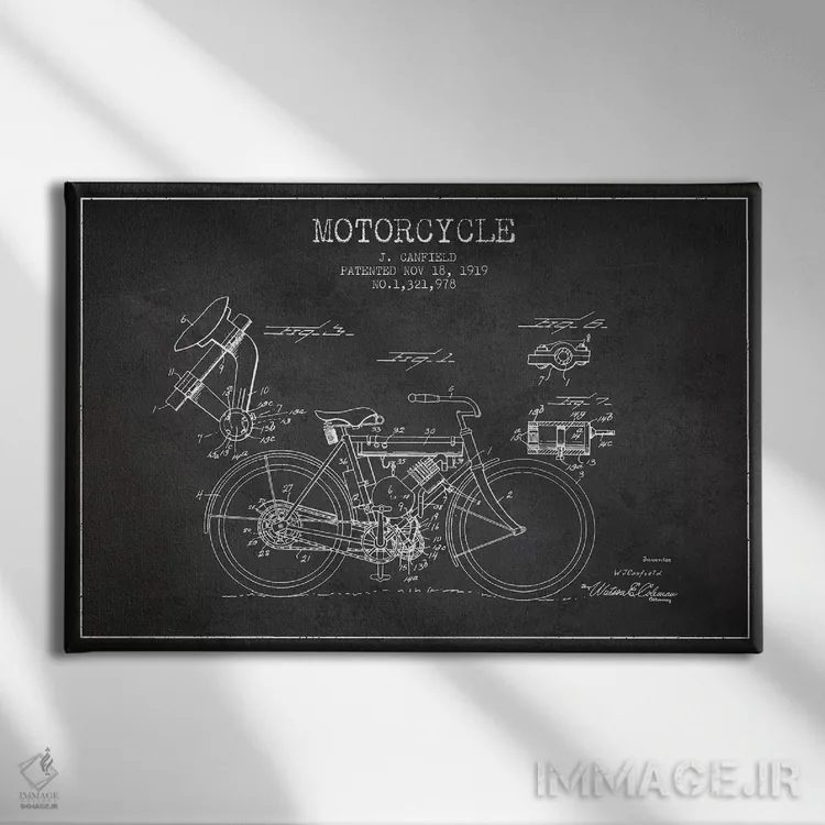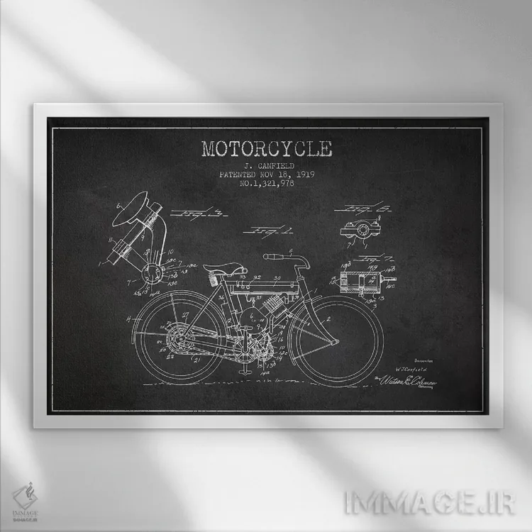 تابلو طرح اختراع موتورسیکلت جی. کانفیلد (زغالسنگی) اثر پیکسل کهنه (استودیو/نام هنری)