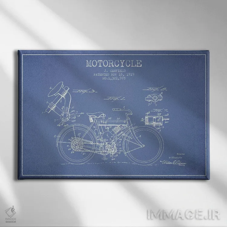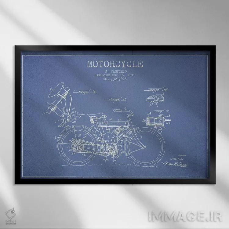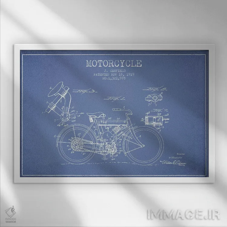 تابلو طرح اختراع موتورسیکلت جی. کانفیلد (آبی روشن) اثر پیکسل کهنه (استودیو/نام هنری)