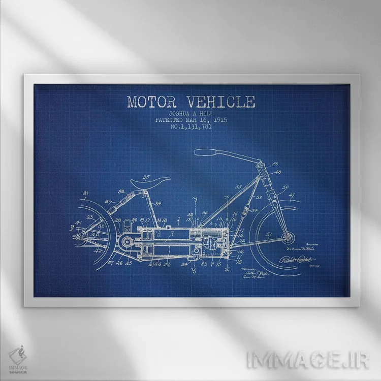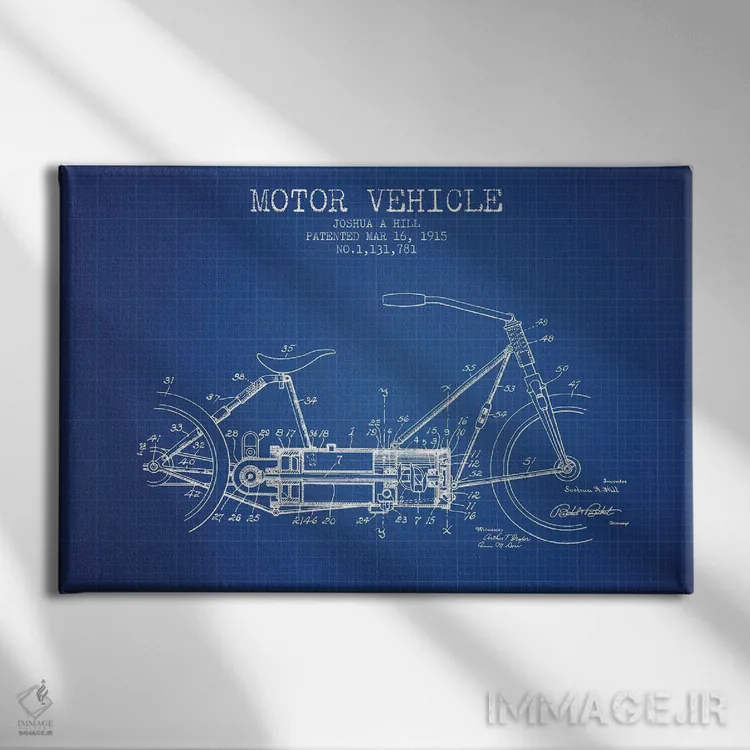 تابلو دکوراتیوِ «طرح پتنت وسیله نقلیه موتوری جوشوا ای. هیل (شبکه آبی)»؛ مناسب برای فضاهایی با چوب تیره، چراغهای گرم و اکسسوریهای کلاسیک اثرِ «پیکسل کهنه (استودیو/نام هنری)».