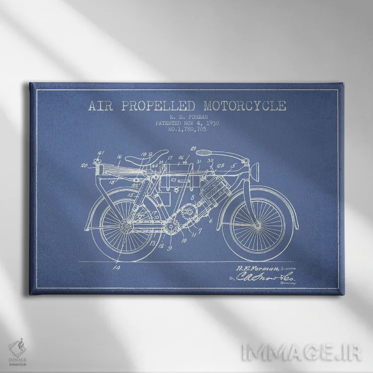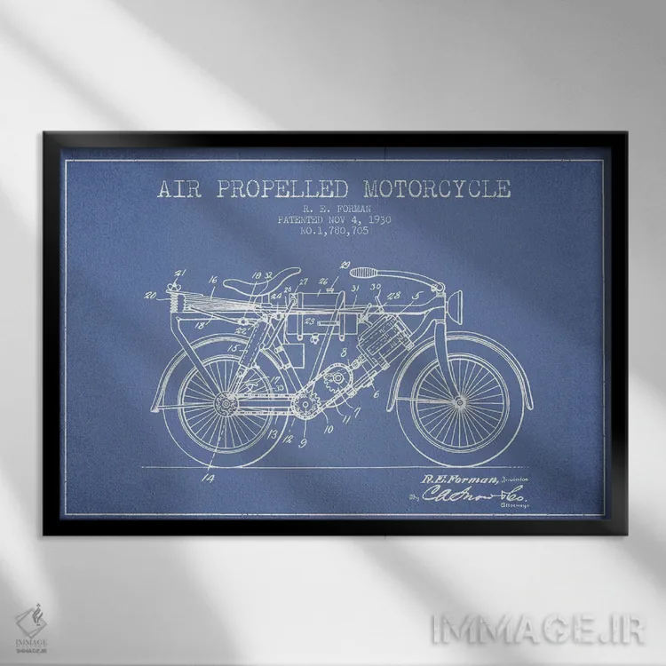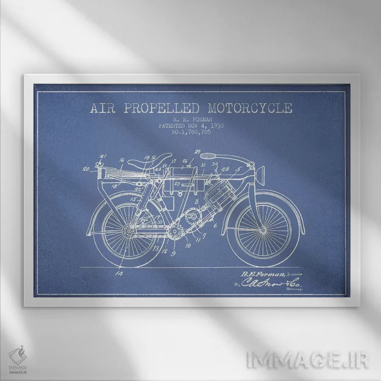 «طرح پتنت موتورسیکلت با پیشران هوا آر.ای. فورمن (آبی روشن)» اثرِ «پیکسل کهنه (استودیو/نام هنری)» برای راهرو، ورودی یا دیوارهای کوچک هم گزینهی خوبیست؛ چون حسش فوری منتقل میشود.