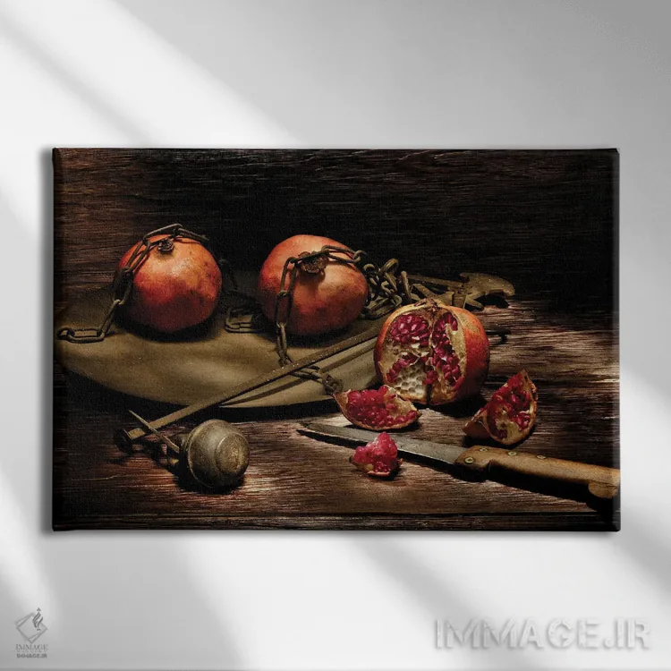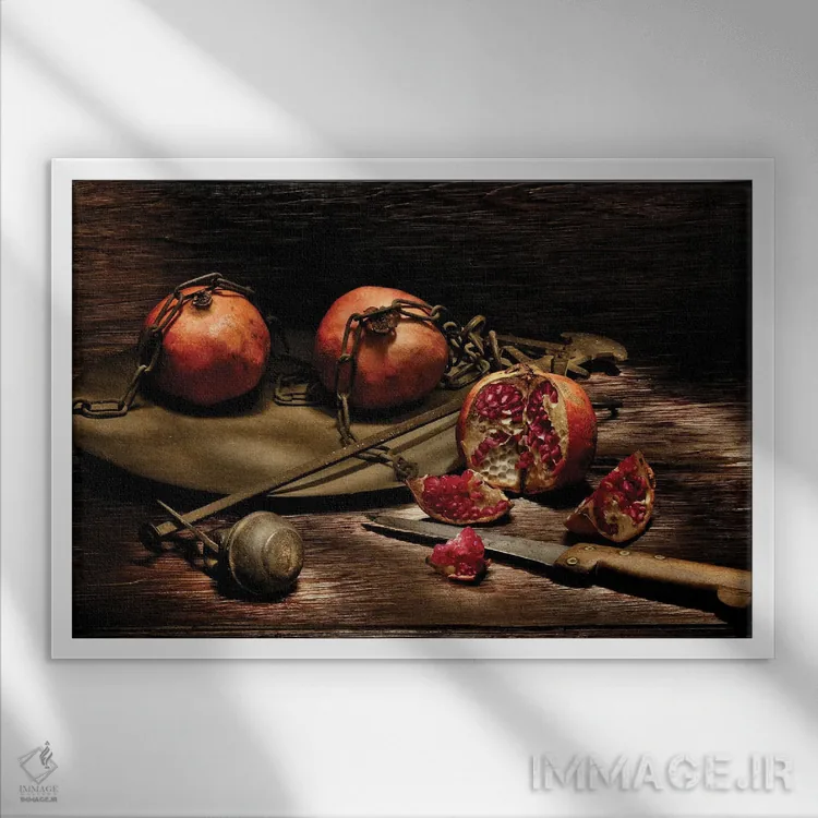 تابلو دکوراتیو انار با چاقو روی میز چوبی اثر آلساندرو دلا توره