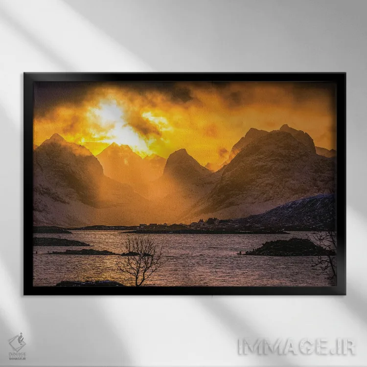 تابلو غروب کوه‌های مجمع‌الجزایر لوفوتن نروژ اثر الکس جی پرز - نمای قاب‌دار مشکی