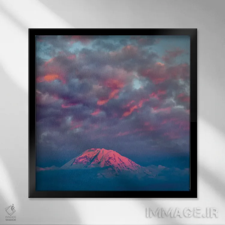 تابلو کوه رینیر در غروب، ایالت واشنگتن اثر آدام جونز - نمای قاب‌دار مشکی