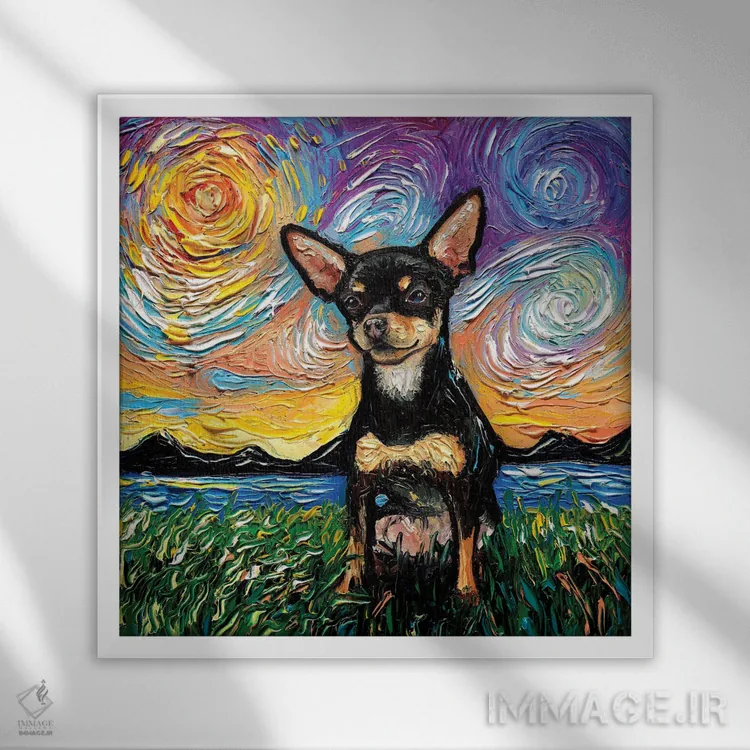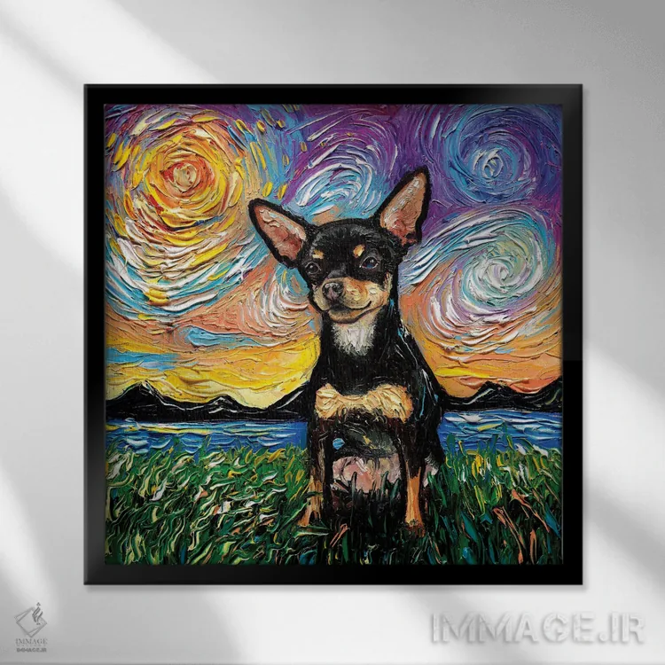 برای دیوارهای ساده، «شب چیواوا سیاه و قهوهای موکوتاه» اثرِ «آجا تریر» در کنار رنگهای خنثی، تضاد دلچسبی میسازد؛ برای دکورهایی با رنگهای خنثی انتخابی خوشسلیقه است. با قاب چوبی یا مشکی، حس مرتبتری پیدا میکند.