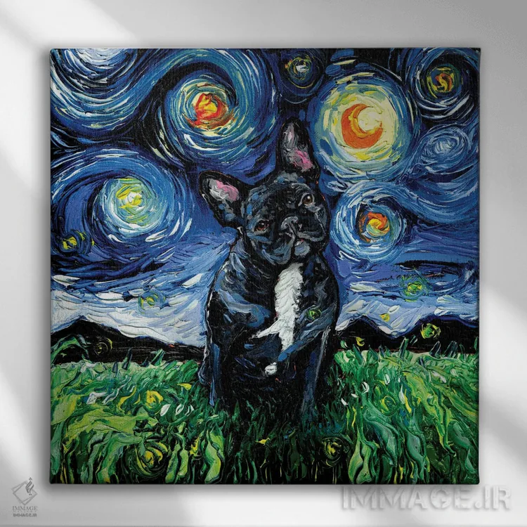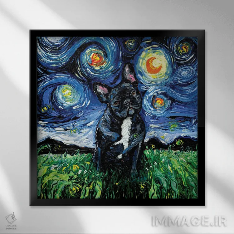 اگر میخواهید دیوار کمی سرزندگیِ محترمانه داشته باشد، «شب بولداگ فرانسوی سیاه و سفید» اثرِ «آجا تریر» گرما و شخصیت به فضا اضافه میکند، برای راهروها و ورودیهای گرم گزینهٔ مناسبیست. با نورپردازی نقطهای، جذابتر هم میشود.