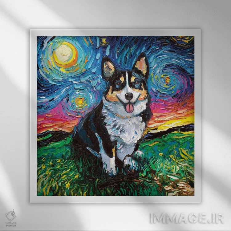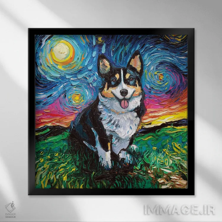 تابلو شب کورگی سه‌رنگ اثر آجا تریر - نمای قاب‌دار مشکی