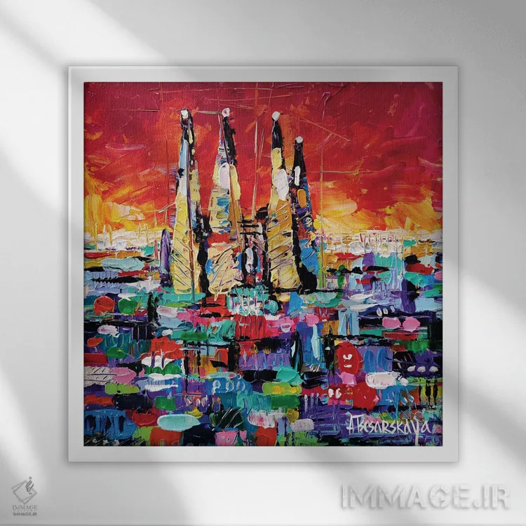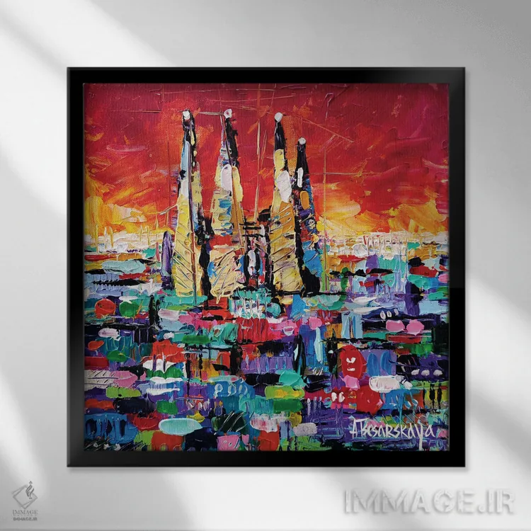 «غروب در بارسلون» اثرِ «آلیاکساندرا تسسارسکایا» در قالب هنری، به فضا عمق و ریتم میدهد؛ برای کنار مبلمان ساده و نورپردازی گرم عالی است.