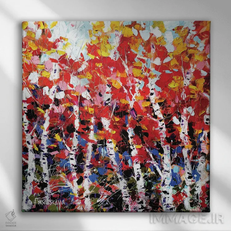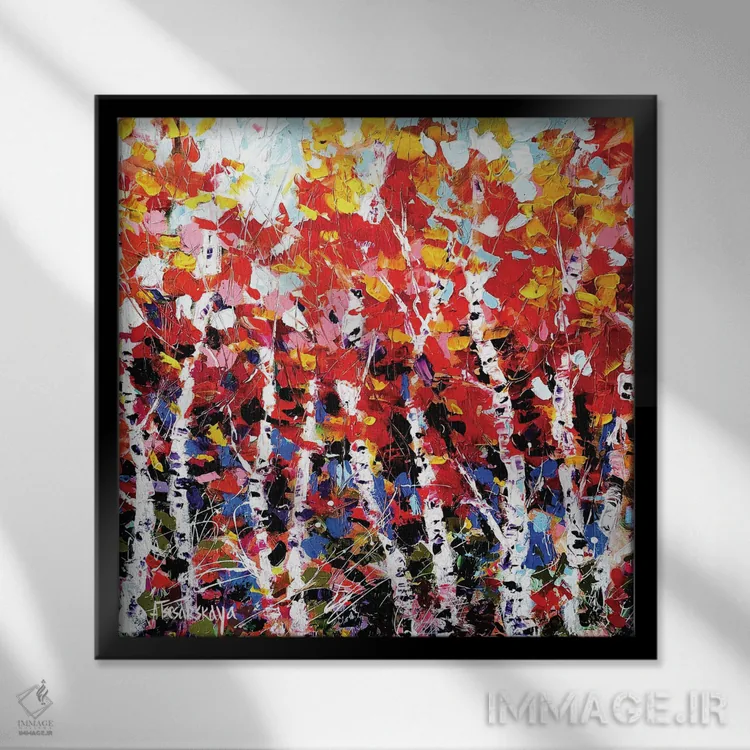 «جنگل پاییزی ۱» اثرِ «آلیاکساندرا تسسارسکایا» یک انتخاب مدرن است؛ سبک هنری کمک میکند چیدمان مرتب بماند و دیوار حرفهای دیده شود.