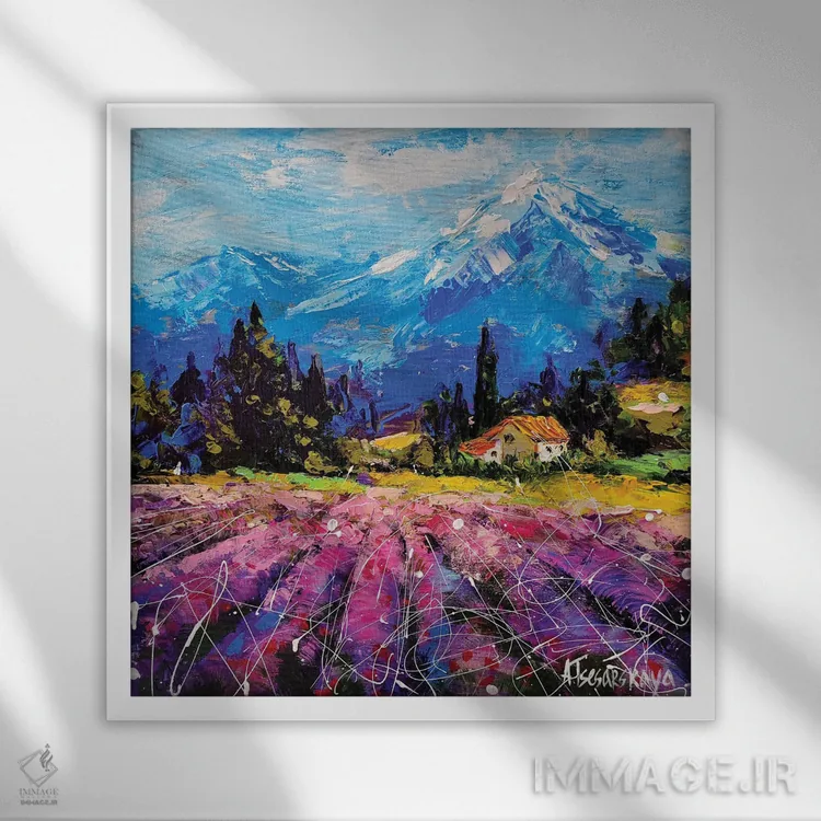 «مزرعه اسطوخودوس با کوه» اثرِ «آلیاکساندرا تسسارسکایا» از آن کارهاییست که در دکورهای جدیتر (نشیمن رسمی یا دفتر کار) عالی مینشیند.