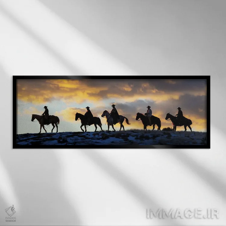 تابلو Shell, Wyoming Hideout Ranch Cowboys And Cowgirls Silhouetted Against Sunset Riding On Ridgeline II,آمریکا، شل، وایومینگ، کابوی‌ها و کابوی دختران در حال سواری سیلوئت‌شده مقابل غروب بر خط‌الرأس ۲ اثر دارل گالین - نمای قاب‌دار سفید