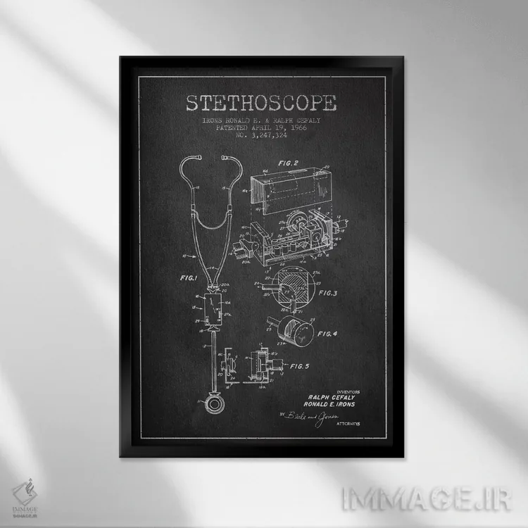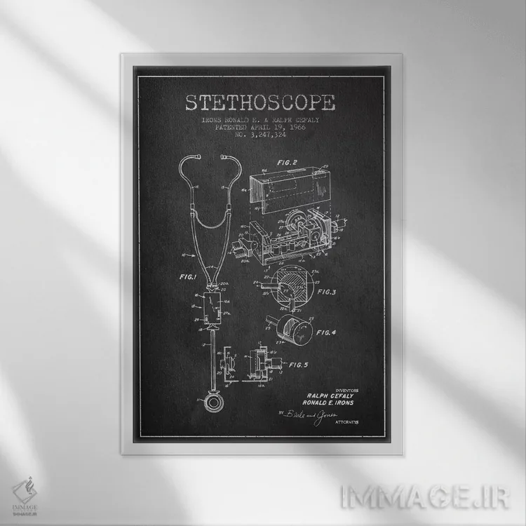 تابلو نقشهٔ ثبت اختراع گوشی پزشکی خاکستری اثر پیکسل کهنه (استودیو/نام هنری) - نمای روبه‌رو روی دیوار