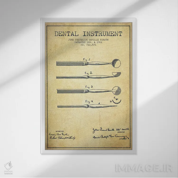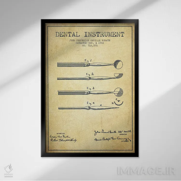 «نقشهٔ ثبت اختراع ابزار دندانپزشکی (طرح کلاسیک)» اثرِ «پیکسل کهنه (استودیو/نام هنری)» برای فضاهای گرم و صمیمی مناسب است؛ بهخصوص کنار چوب تیره و نور زرد.