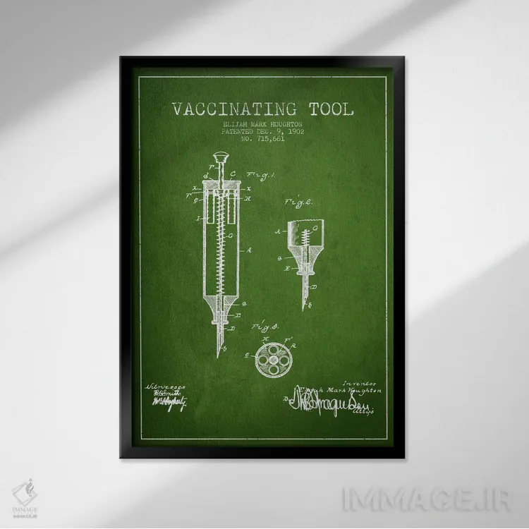 تابلو نقشهٔ ثبت اختراع ابزار واکسیناسیون سبز اثر پیکسل کهنه (استودیو/نام هنری) - نمای قاب‌دار مشکی