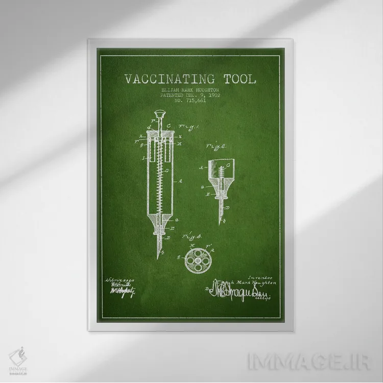 تابلو نقشهٔ ثبت اختراع ابزار واکسیناسیون سبز اثر پیکسل کهنه (استودیو/نام هنری) - نمای قاب‌دار سفید