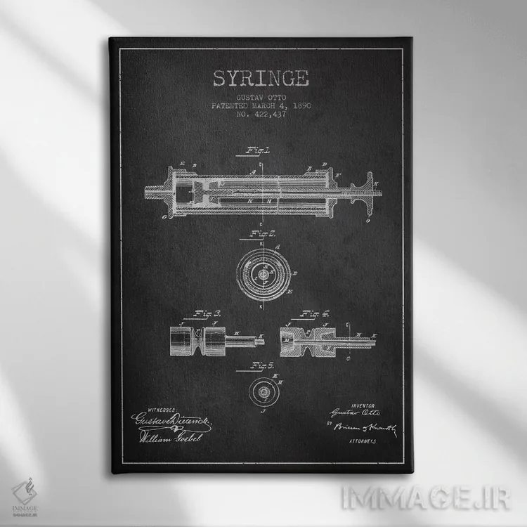 «نقشهٔ ثبت اختراع سرنگ خاکستری» اثرِ «پیکسل کهنه (استودیو/نام هنری)» با حالوهوای هنری، حس نوستالژیِ کنترلشدهای به فضا میدهد؛ مناسب برای چیدمانهای رترو و کلاسیک.
