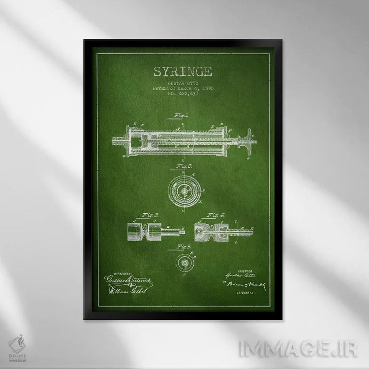 تابلو نقشهٔ ثبت اختراع سرنگ سبز اثر پیکسل کهنه (استودیو/نام هنری) - نمای قاب‌دار مشکی