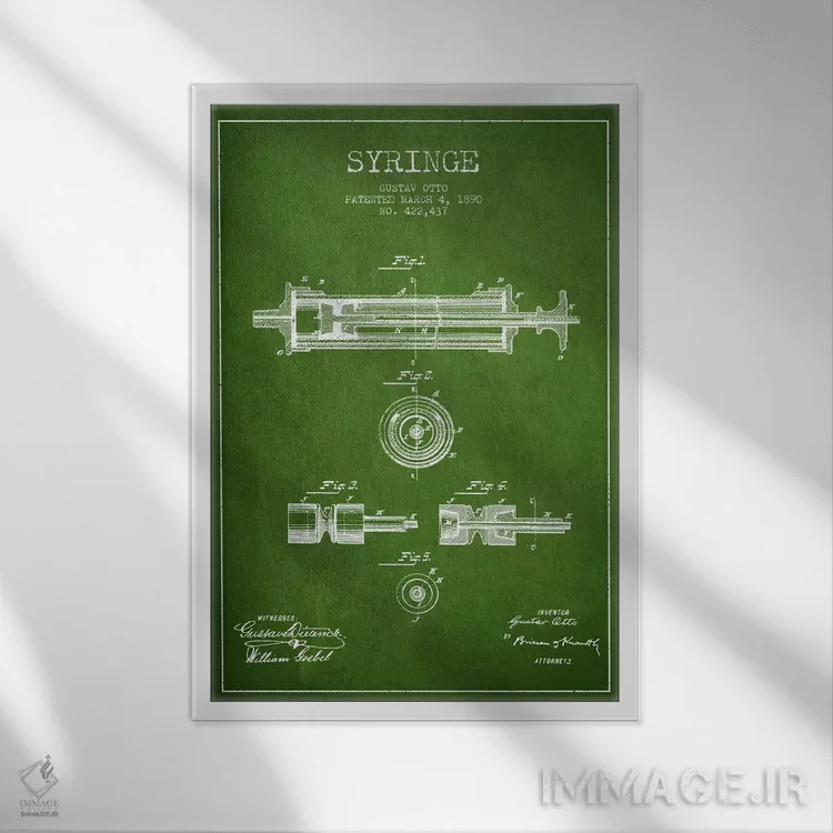 تابلو نقشهٔ ثبت اختراع سرنگ سبز اثر پیکسل کهنه (استودیو/نام هنری) - نمای قاب‌دار سفید