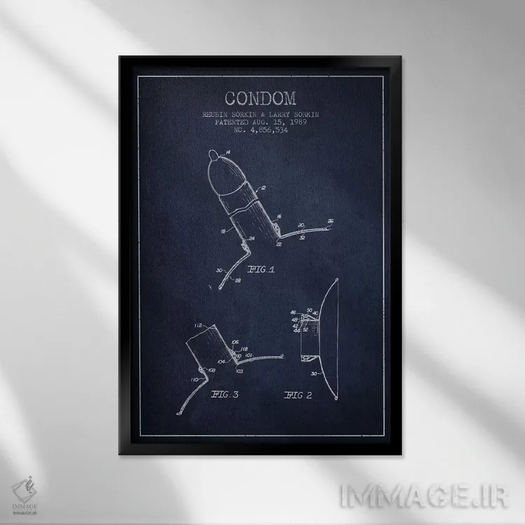 تابلو دکوراتیوِ «نقشهٔ ثبت اختراع کاندوم (آبی نفتی)»؛ مناسب برای فضاهایی با چوب تیره، چراغهای گرم و اکسسوریهای کلاسیک اثرِ «پیکسل کهنه (استودیو/نام هنری)».
