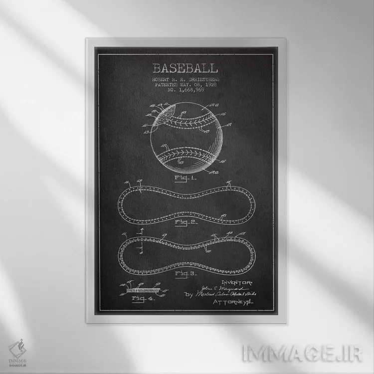 «نقشهٔ ثبت اختراع توپ بیسبال (زغالی)» اثرِ «پیکسل کهنه (استودیو/نام هنری)» با حالوهوای هنری، حس نوستالژی را شیک و دکورپذیر به فضا اضافه میکند.