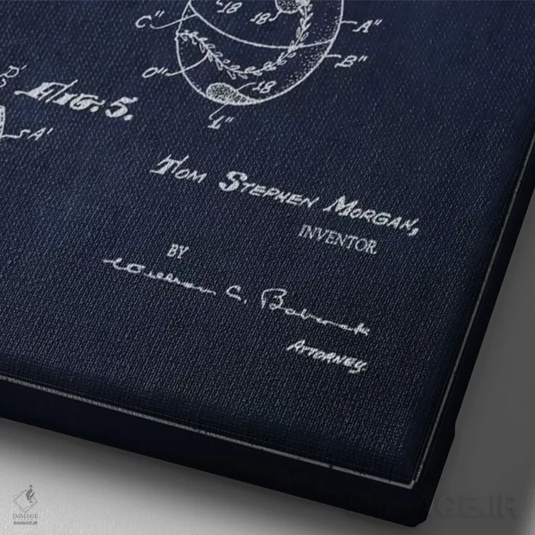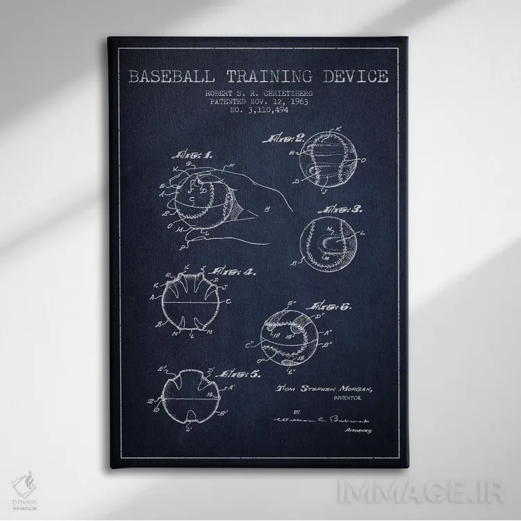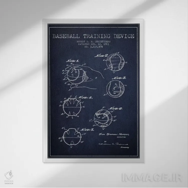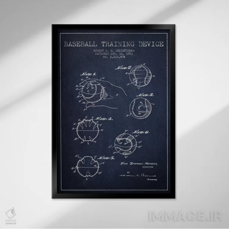 «نقشهٔ ثبت اختراع ابزار بیسبال (آبی سرمهای)» اثرِ «پیکسل کهنه (استودیو/نام هنری)» با حالوهوای هنری، حس نوستالژی را شیک و دکورپذیر به فضا اضافه میکند.