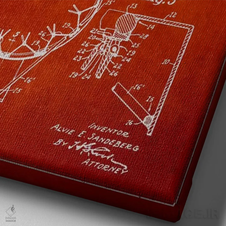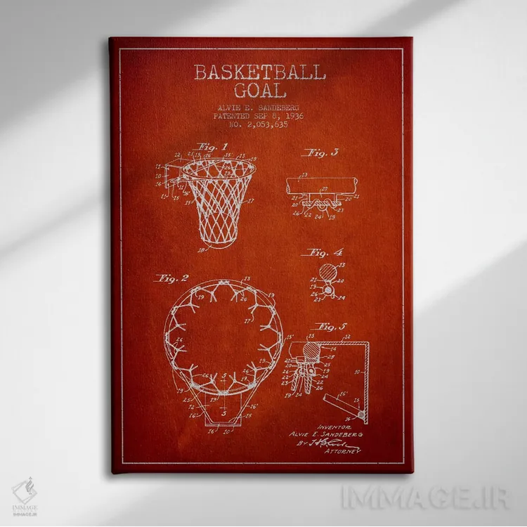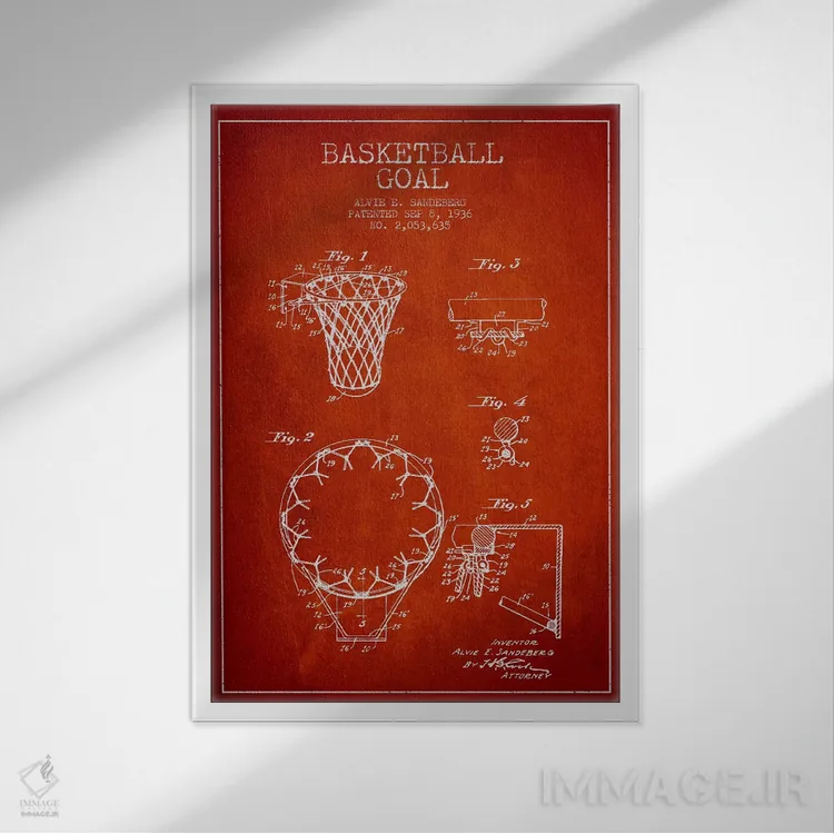 «نقشهٔ ثبت اختراع حلقه بسکتبال (قرمز)» اثرِ «پیکسل کهنه (استودیو/نام هنری)» برای فضاهای گرم و صمیمی مناسب است؛ بهخصوص کنار چوب تیره و نور زرد.