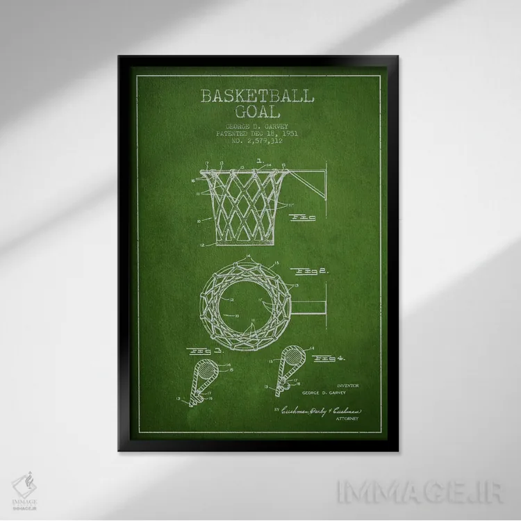 «نقشهٔ ثبت اختراع حلقه بسکتبال (سبز)» اثرِ «پیکسل کهنه (استودیو/نام هنری)» کنار پوسترها و قابهای ساده، یک ترکیب دلنشین و متعادل میسازد.