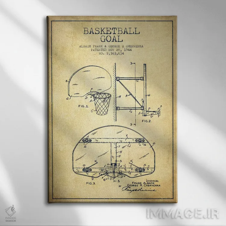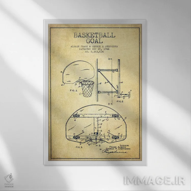 اگر دکور شما کلاسیک/رترو است، «نقشهٔ ثبت اختراع حلقه بسکتبال (اثر F. Albach و G.R. Chervenka) (قدیمی)» اثرِ «پیکسل کهنه (استودیو/نام هنری)» با سبک هنری کاملاًً مینشیند.