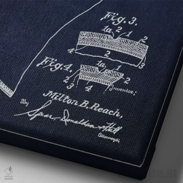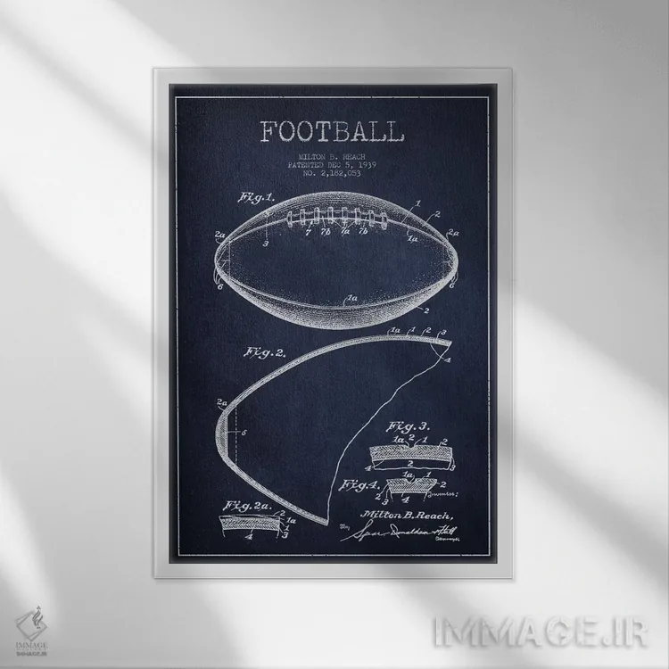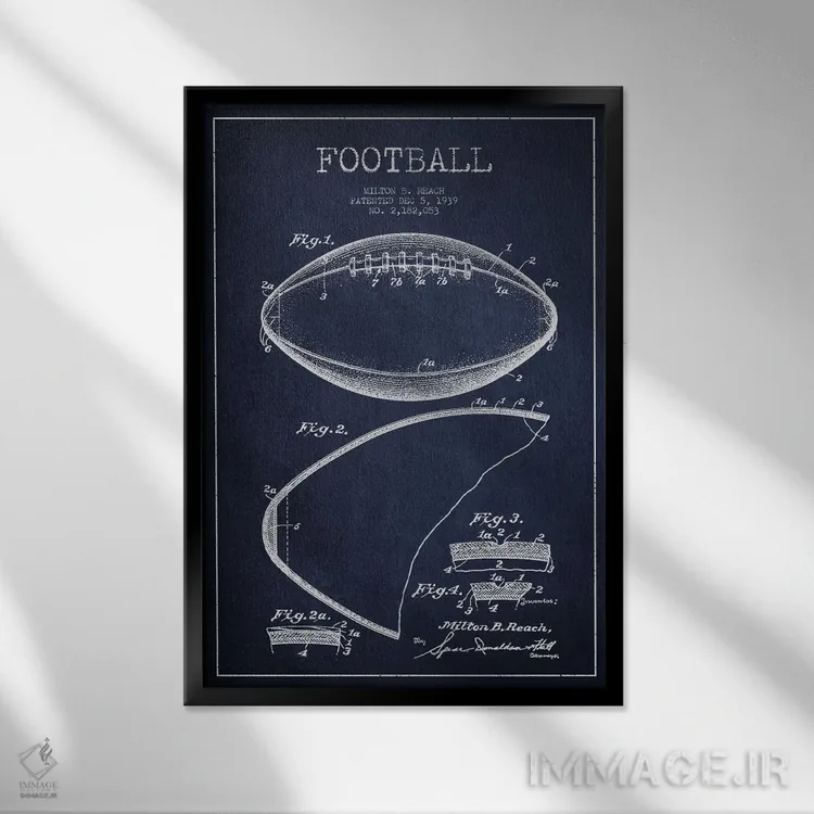 «نقشهٔ ثبت اختراع توپ فوتبال (آبی سرمهای)» اثرِ «پیکسل کهنه (استودیو/نام هنری)» برای راهرو، ورودی یا دیوارهای کوچک هم گزینهی خوبیست؛ چون حسش فوری منتقل میشود.