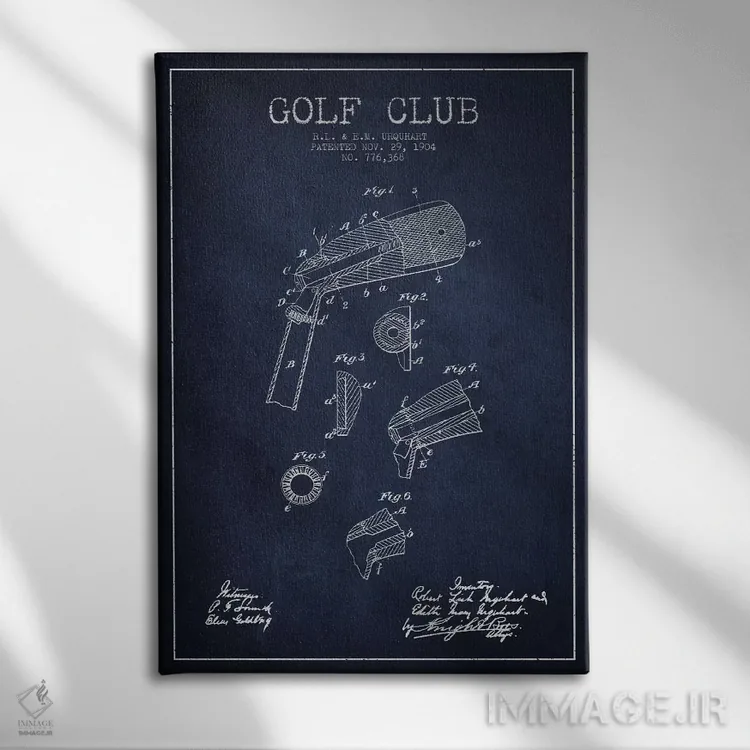 تابلو دکوراتیوِ «نقشهٔ ثبت اختراع چوب گلف (آبی سرمهای)»؛ مناسب برای فضاهایی با چوب تیره، چراغهای گرم و اکسسوریهای کلاسیک اثرِ «پیکسل کهنه (استودیو/نام هنری)».