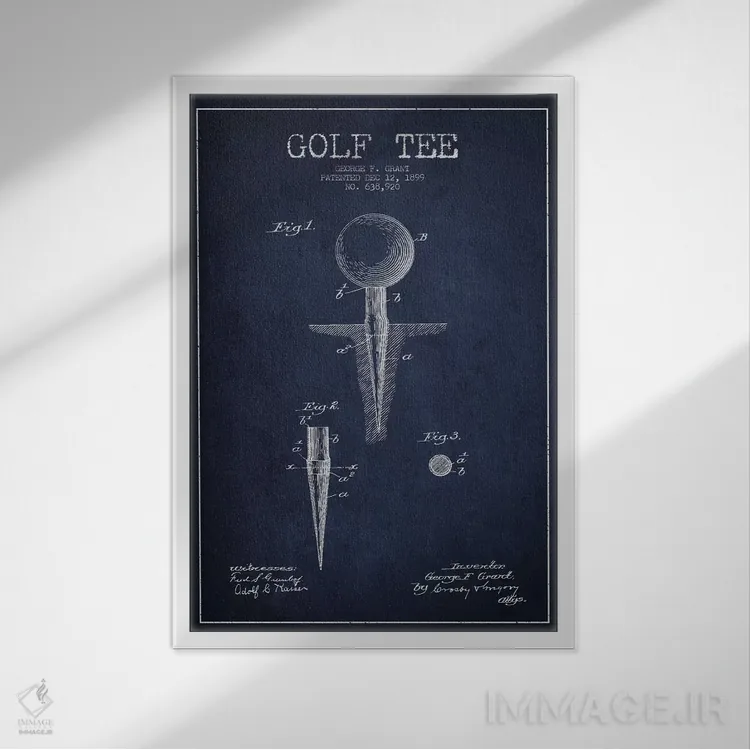 «نقشهٔ ثبت اختراع پایه توپ گلف (آبی سرمهای)» اثرِ «پیکسل کهنه (استودیو/نام هنری)» کنار پوسترها و قابهای ساده، یک ترکیب دلنشین و متعادل میسازد.