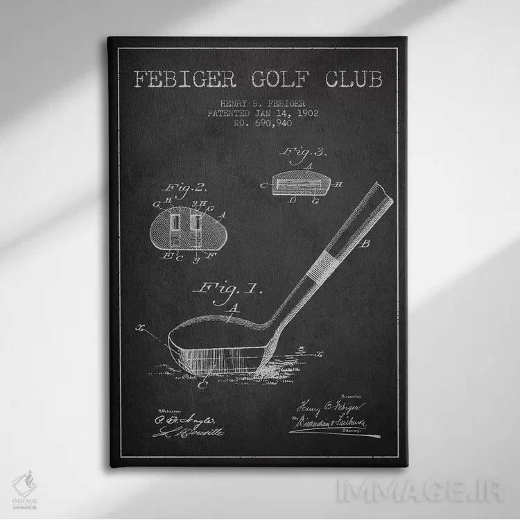 تابلو دکوراتیوِ «نقشهٔ ثبت اختراع چوب گلف فیبیگر (زغالسنگی)»؛ مناسب برای فضاهایی با چوب تیره، چراغهای گرم و اکسسوریهای کلاسیک اثرِ «پیکسل کهنه (استودیو/نام هنری)».