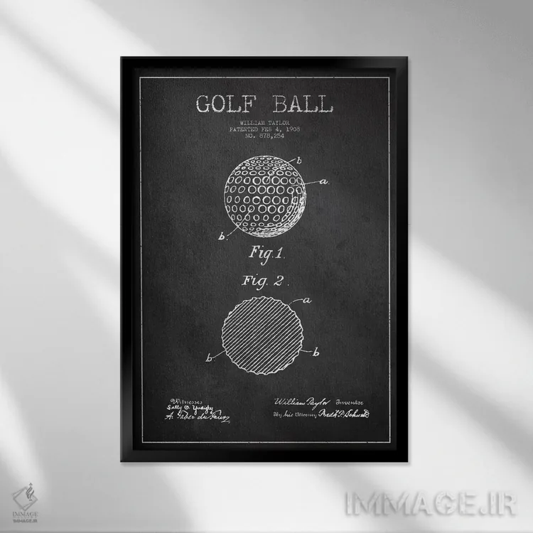 تابلو دکوراتیوِ «نقشهٔ ثبت اختراع توپ گلف (زغالسنگی)»؛ مناسب برای فضاهایی با چوب تیره، چراغهای گرم و اکسسوریهای کلاسیک اثرِ «پیکسل کهنه (استودیو/نام هنری)».