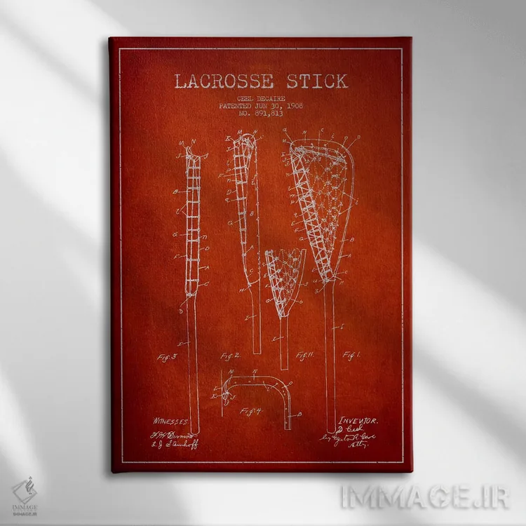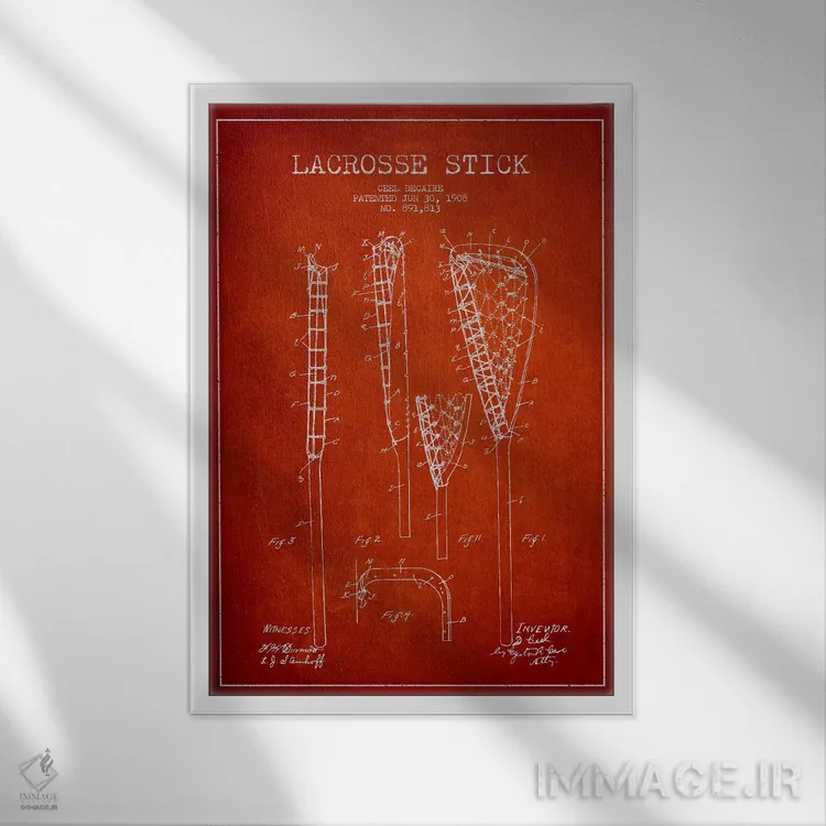 «نقشهٔ ثبت اختراع چوب لاکروس (قرمز)» اثرِ «پیکسل کهنه (استودیو/نام هنری)» کنار پوسترها و قابهای ساده، یک ترکیب دلنشین و متعادل میسازد.