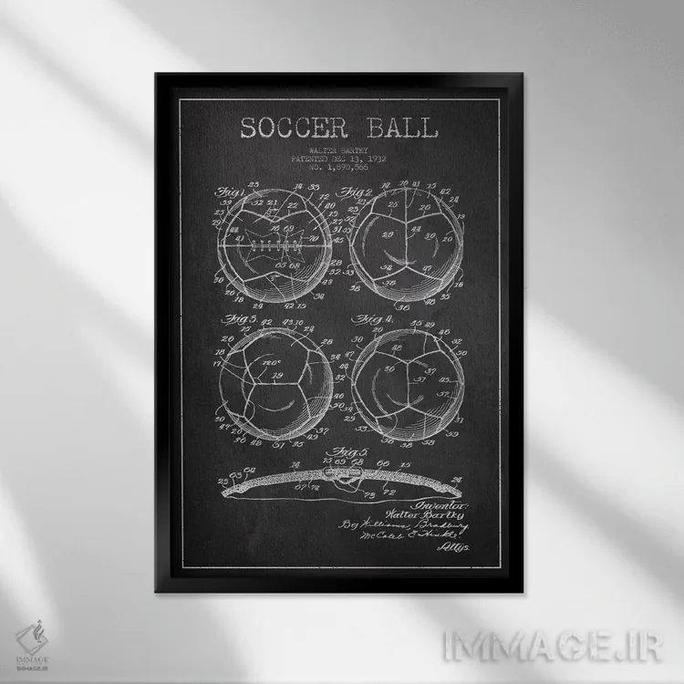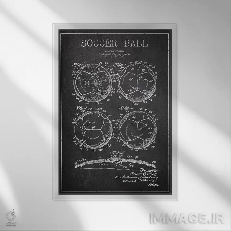 تابلو دکوراتیوِ «نقشهٔ ثبت اختراع توپ فوتبال بارتکی (زغالی)»؛ مناسب برای فضاهایی با چوب تیره، چراغهای گرم و اکسسوریهای کلاسیک اثرِ «پیکسل کهنه (استودیو/نام هنری)».
