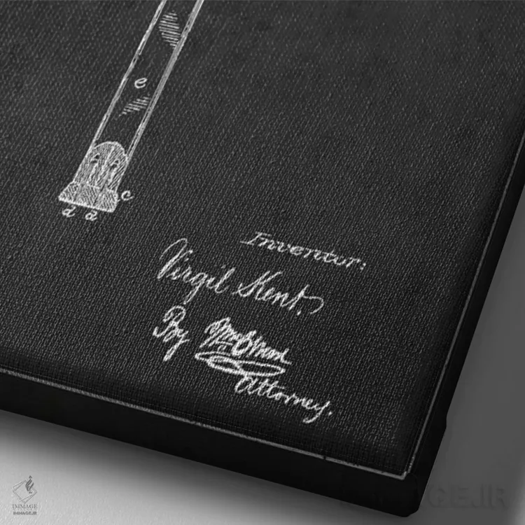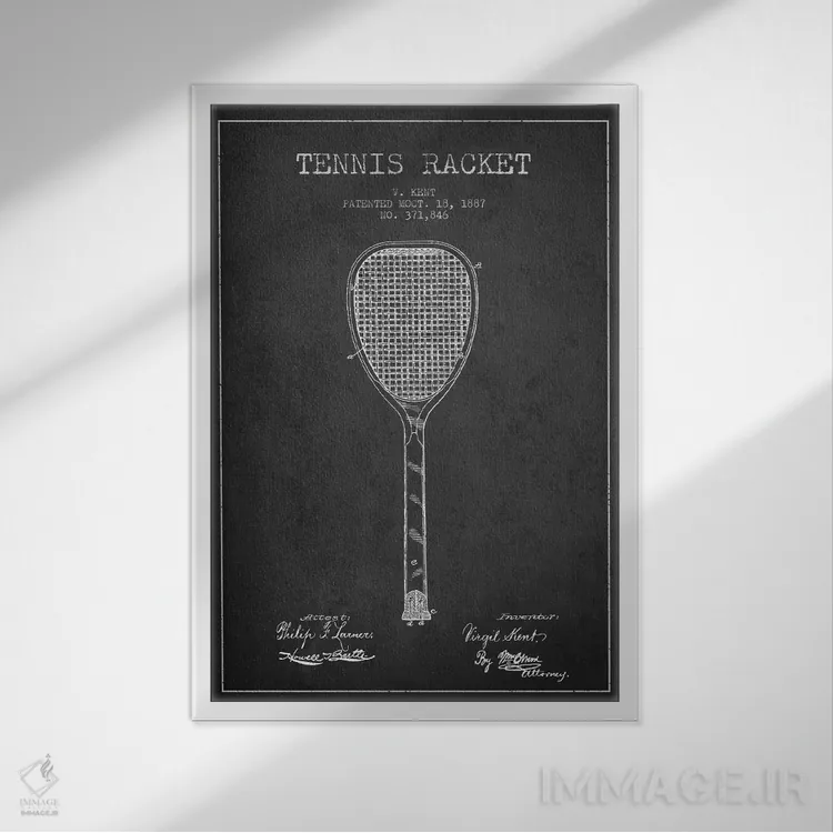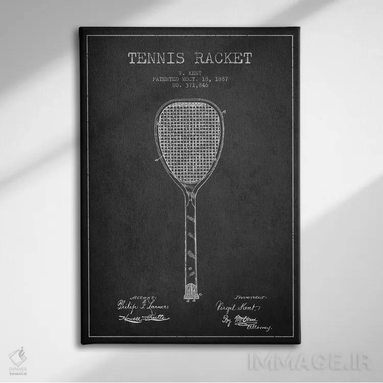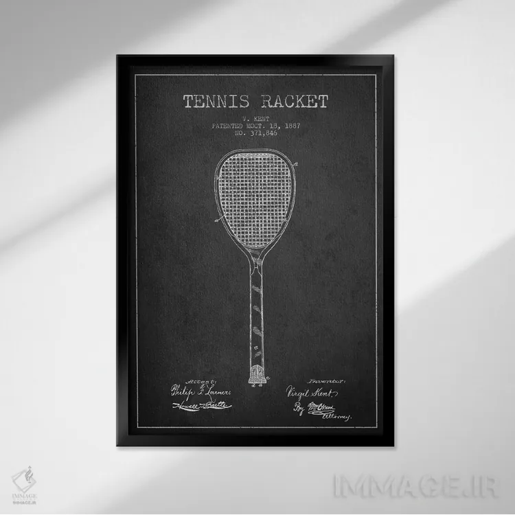 «نقشهٔ ثبت اختراع راکت تنیس (زغالی)» اثرِ «پیکسل کهنه (استودیو/نام هنری)» با حالوهوای هنری، حس نوستالژی را شیک و دکورپذیر به فضا اضافه میکند.