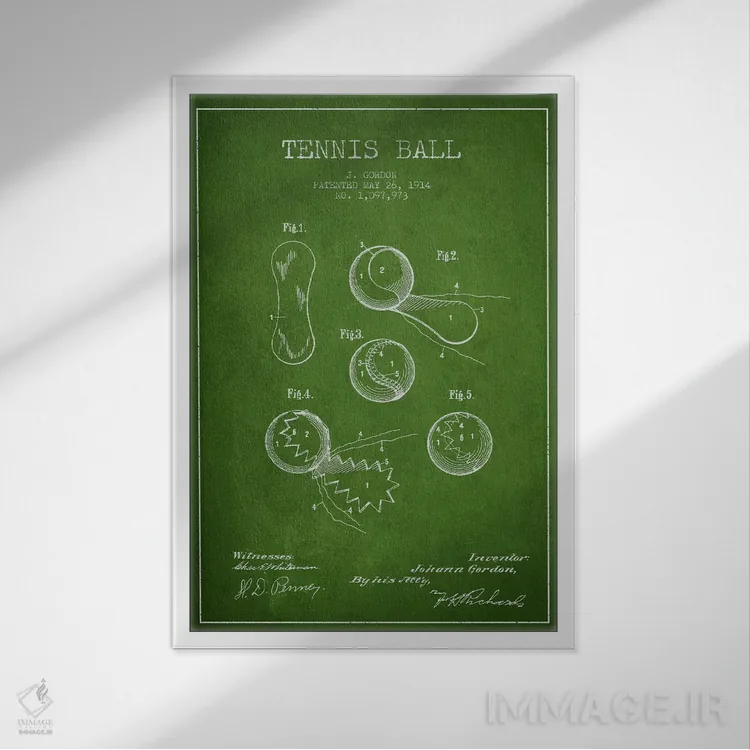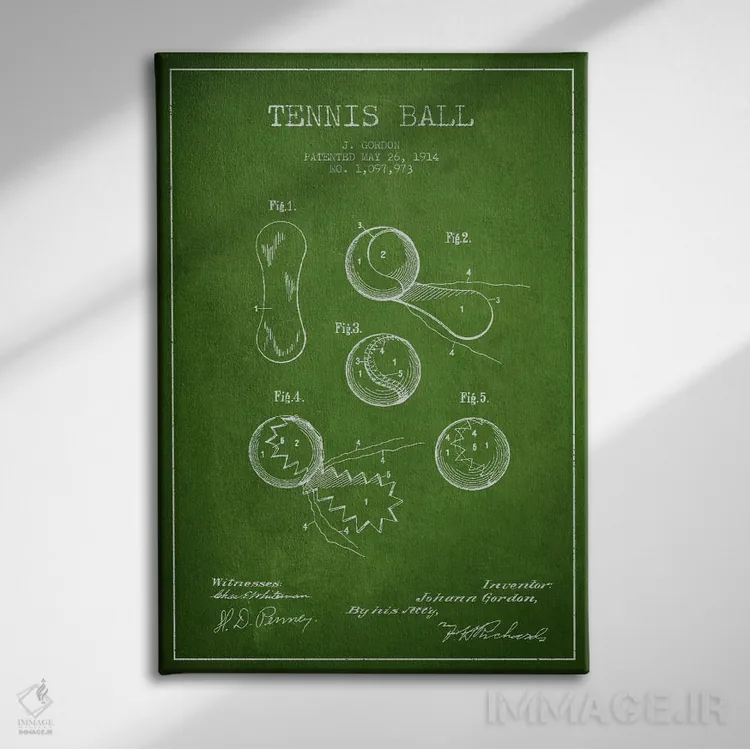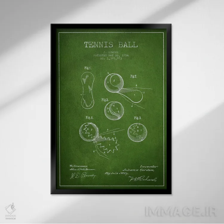«نقشهٔ ثبت اختراع توپ تنیس (سبز)» اثرِ «پیکسل کهنه (استودیو/نام هنری)» برای راهرو، ورودی یا دیوارهای کوچک هم گزینهی خوبیست؛ چون حسش فوری منتقل میشود.