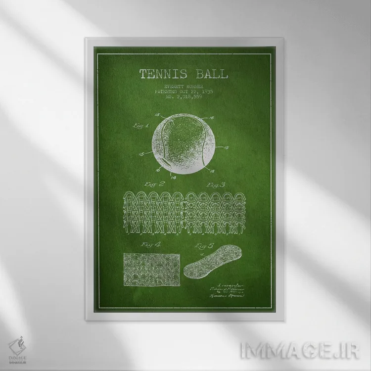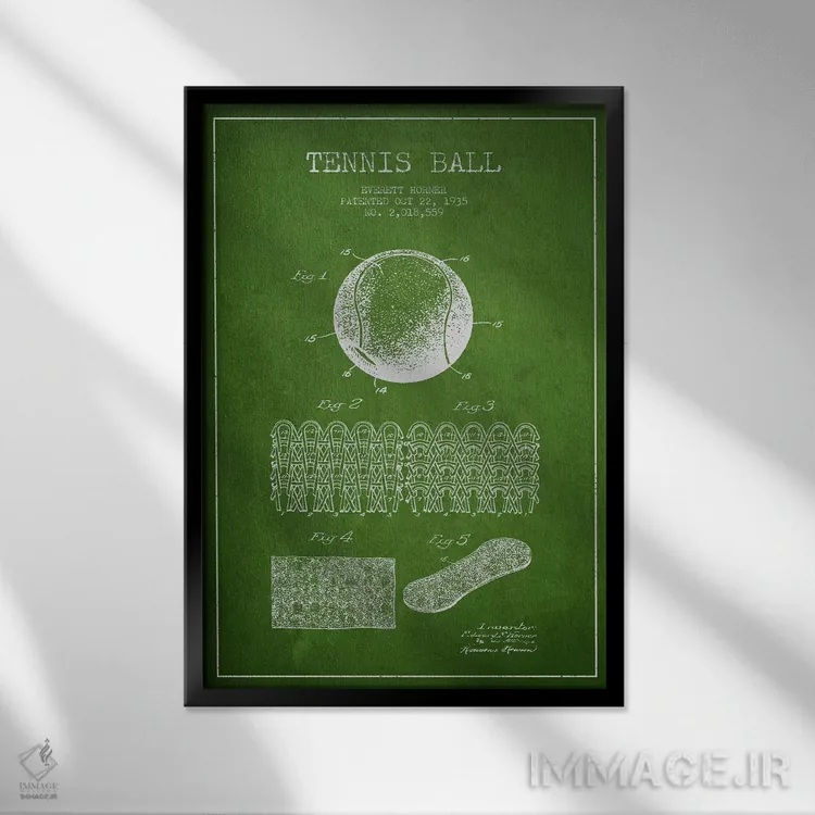 «نقشهٔ ثبت اختراع توپ تنیس (سبز)» اثرِ «پیکسل کهنه (استودیو/نام هنری)» با حالوهوای هنری، حس نوستالژیِ کنترلشدهای به فضا میدهد؛ مناسب برای چیدمانهای رترو و کلاسیک.