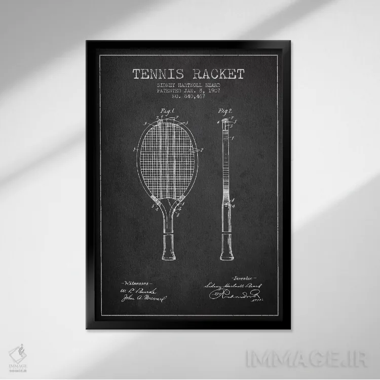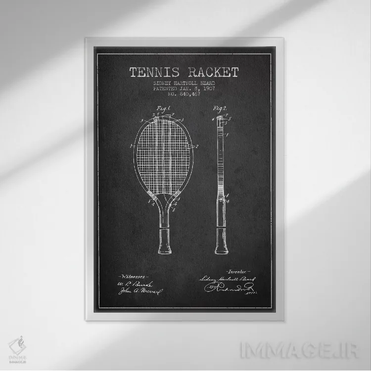 اگر دکور شما کلاسیک/رترو است، «نقشهٔ ثبت اختراع راکت تنیس (زغالی)» اثرِ «پیکسل کهنه (استودیو/نام هنری)» با سبک هنری کاملاًً مینشیند.