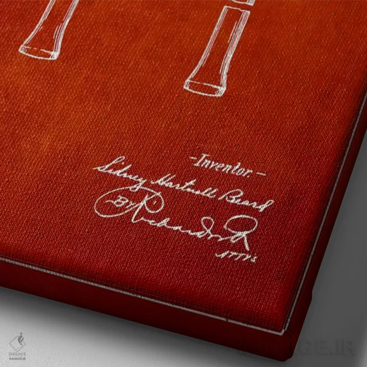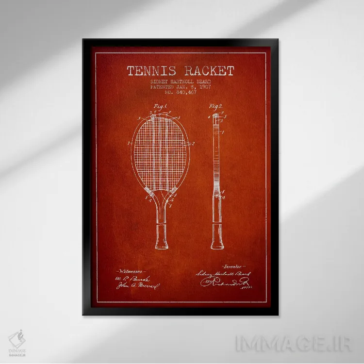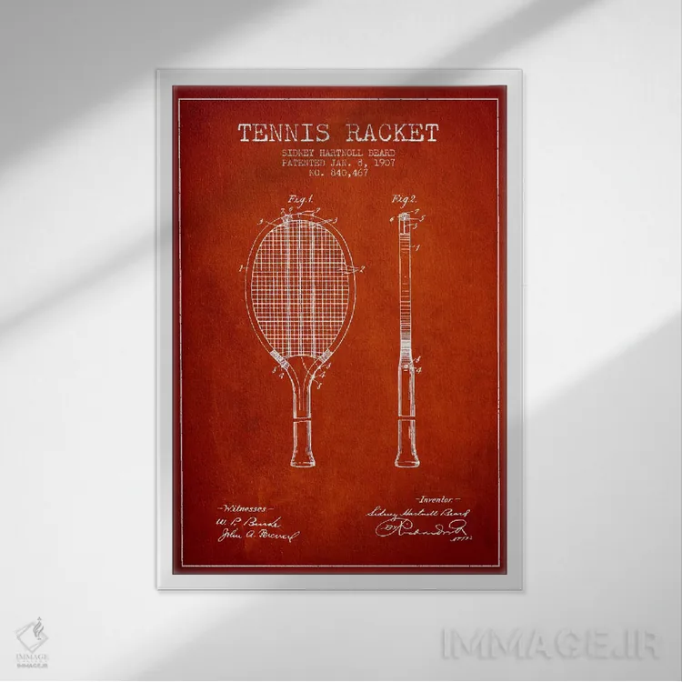 در «نقشهٔ ثبت اختراع راکت تنیس (قرمز)» اثرِ «پیکسل کهنه (استودیو/نام هنری)»، رنگها و فرمها یادآور پوسترهای قدیمیاند؛ انتخابی جذاب برای کافهاستایل و دکورهای شهری.