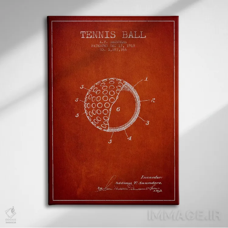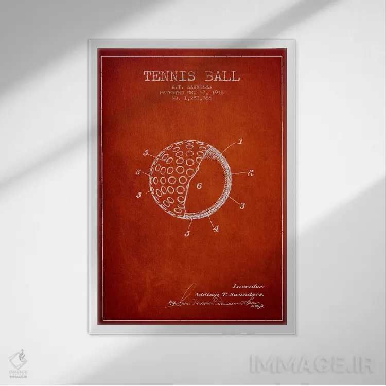 «نقشهٔ ثبت اختراع توپ تنیس (قرمز)» اثرِ «پیکسل کهنه (استودیو/نام هنری)» برای راهرو، ورودی یا دیوارهای کوچک هم گزینهی خوبیست؛ چون حسش فوری منتقل میشود.