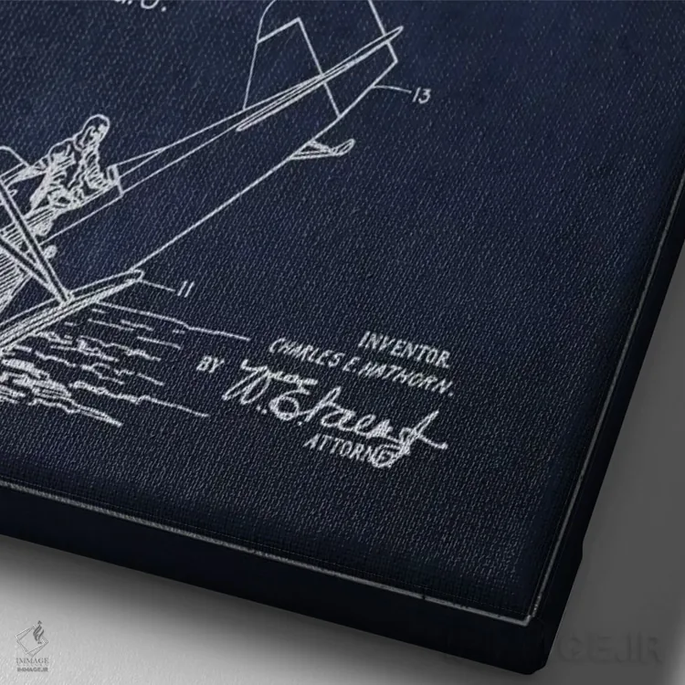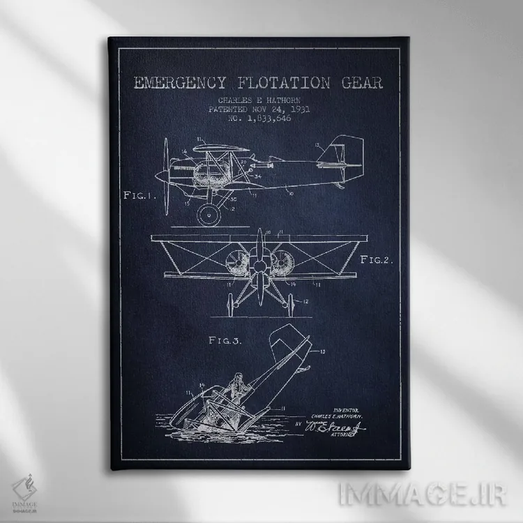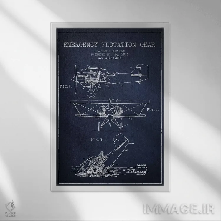 «نقشهٔ ثبت اختراع هواپیمای آبنشین (آبی نفتی)» اثرِ «پیکسل کهنه (استودیو/نام هنری)» برای فضاهای گرم و صمیمی مناسب است؛ بهخصوص کنار چوب تیره و نور زرد.
