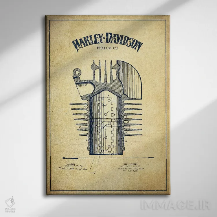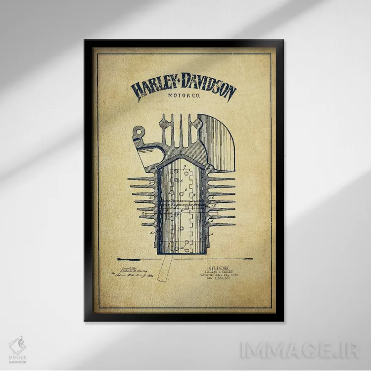در «نقشه ثبت اختراع هارلی—دیویدسون (کلاسیک)» اثرِ «پیکسل کهنه (استودیو/نام هنری)»، رنگها و فرمها یادآور پوسترهای قدیمیاند؛ انتخابی جذاب برای کافهاستایل و دکورهای شهری.